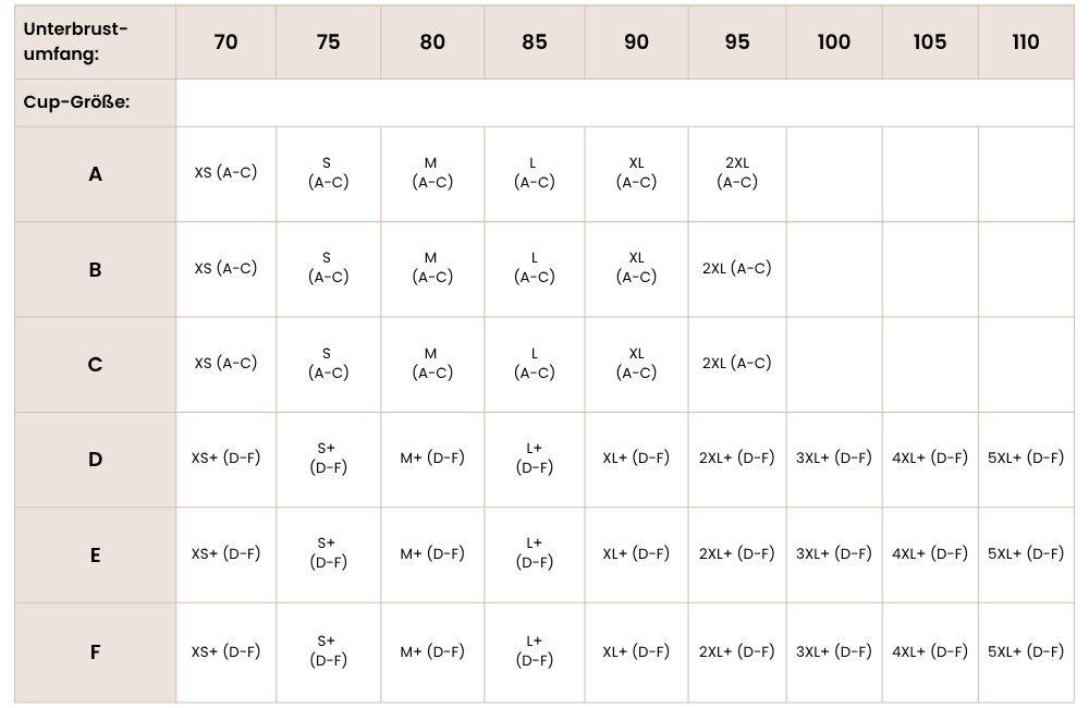Richte dich bei diesen Sport-BHs bitte nach der folgenden Größentabelle.