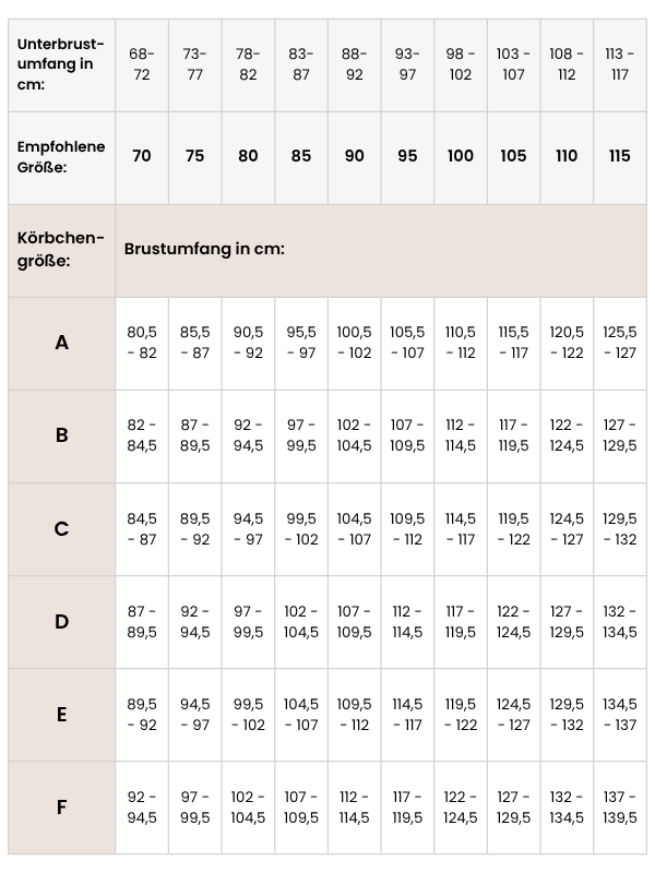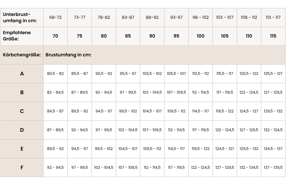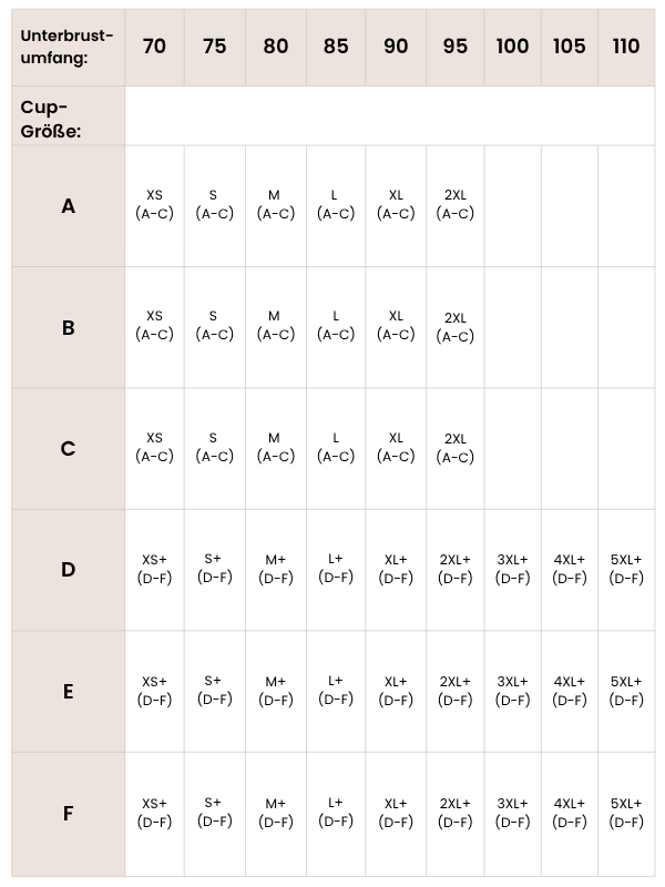 Solltest du genau zwischen 2 Körbchen-Größen liegen, wähle das kleine Körbchen wenn du mehr Halt benötigst oder das Größere wenn du lieber mehr Komfort möchtest.